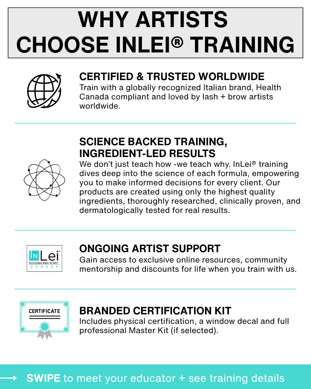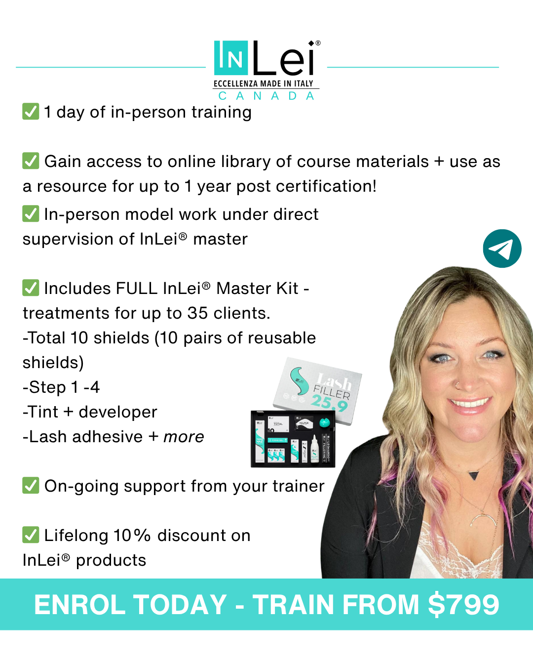 Each kit could yield up to $3500 in treatments, making it a worthwhile investment. This kit can provide approximately 30+ treatments. No other product on the market can match InLei®'s quality and testing to ensure and protect the health of your client's eyes and eyelashes. Kit value is $279.97, making this course an absolute steal.