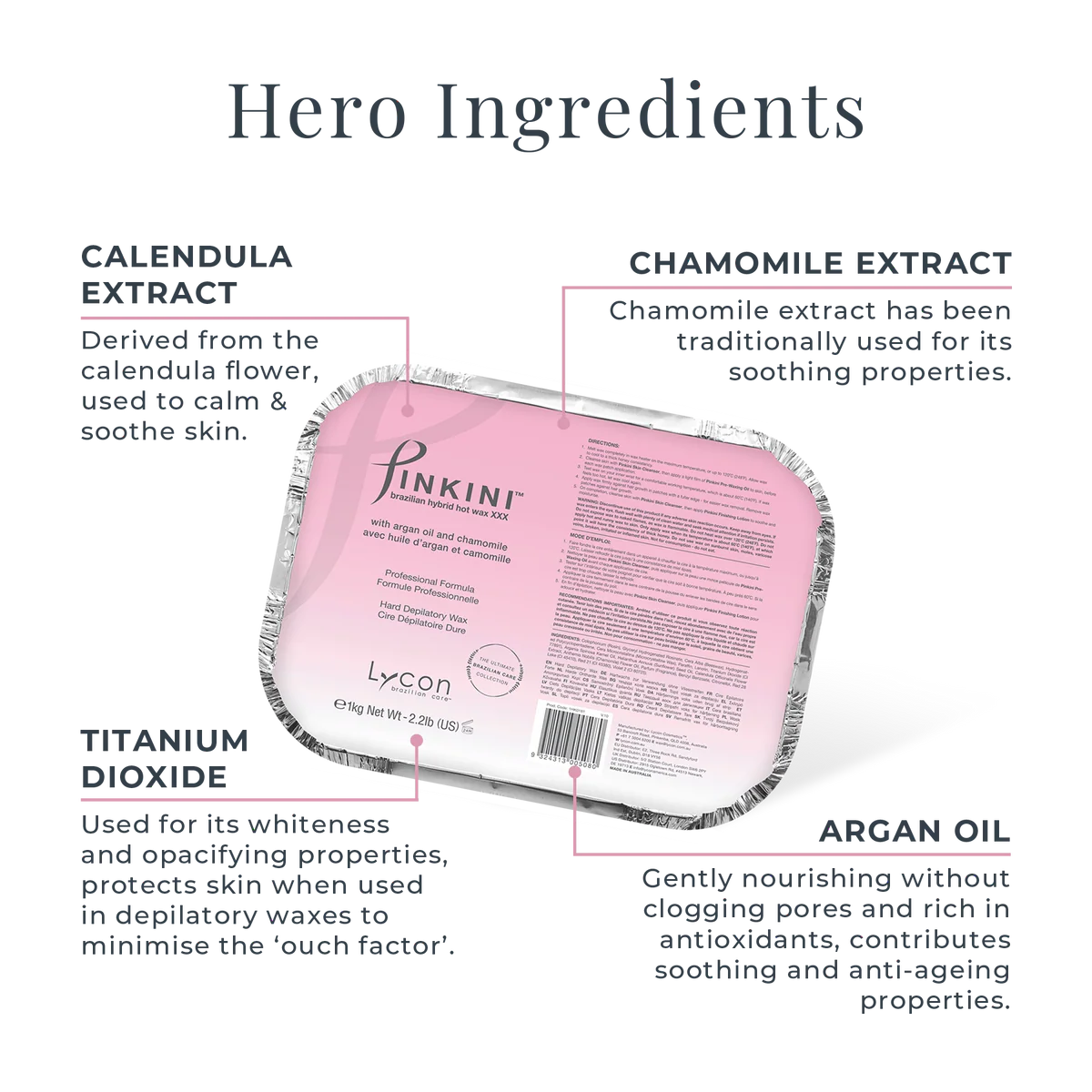 PINKINI est à basse température et offre indéniablement le meilleur des deux mondes pour l'esthéticienne exigeante et est extrêmement confortable pour les clients, car il est pratiquement indolore. Formulé avec la technologie unique de dioxyde de titane de LYCON et de l'huile d'argan, du calendula et de la camomille pour protéger, apaiser et hydrater la peau délicate pendant l'épilation. Il laisse la peau confortable et douce, avec des résultats plus durables.