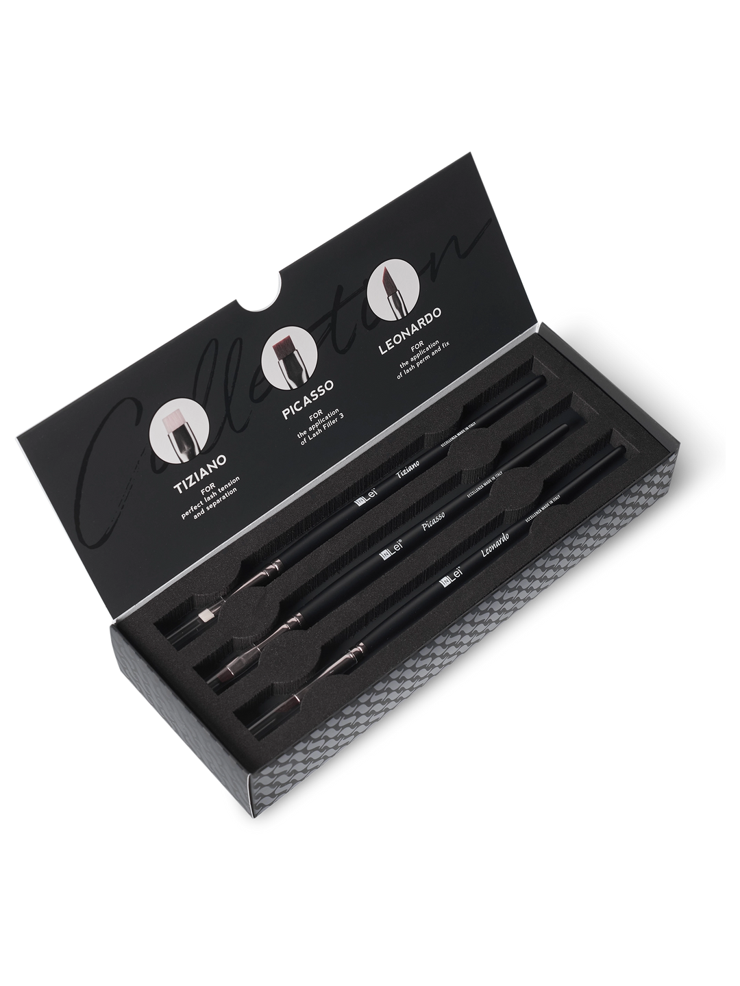 The InLei® Lash Collection Set features three Italian-made professional brushes—Tiziano, Picasso, and Leonardo—crafted to optimize your InLei® Lash Lift or Lash Filler 25.9 treatments. Whether applying solutions at the lash base or styling the hairs into perfect lift position, these tools give you full command of your artistry.